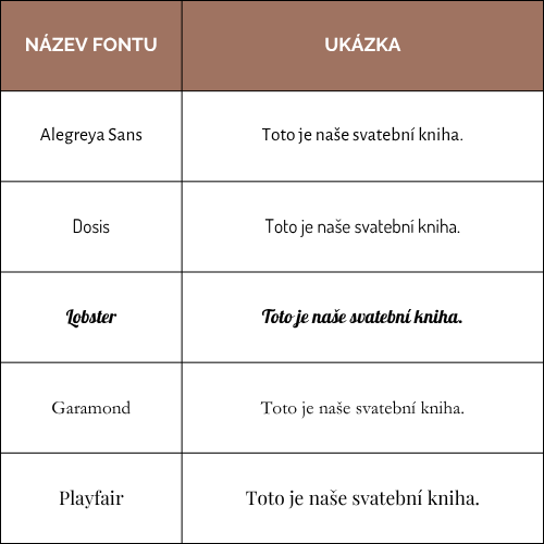 • Možnost textu na vnitřní předsádku (za příplatek), zde ukázka fontů (pro zvětšení klikněte):