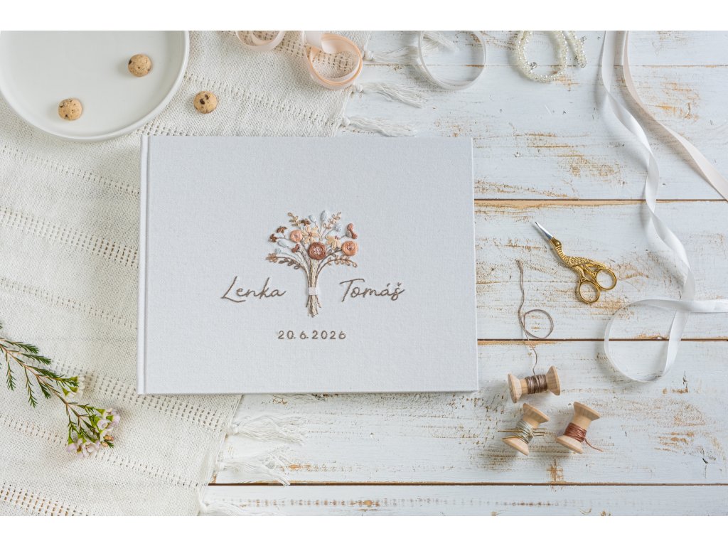 Svatební fotoalbum s ručně šitou vazbou a jemnými proklady. Výšivka svázané kytice v různých barvách přináší svěžest a něžnou eleganci, zatímco jména novomanželů a datum svatby dělají z alba osobitou památku.