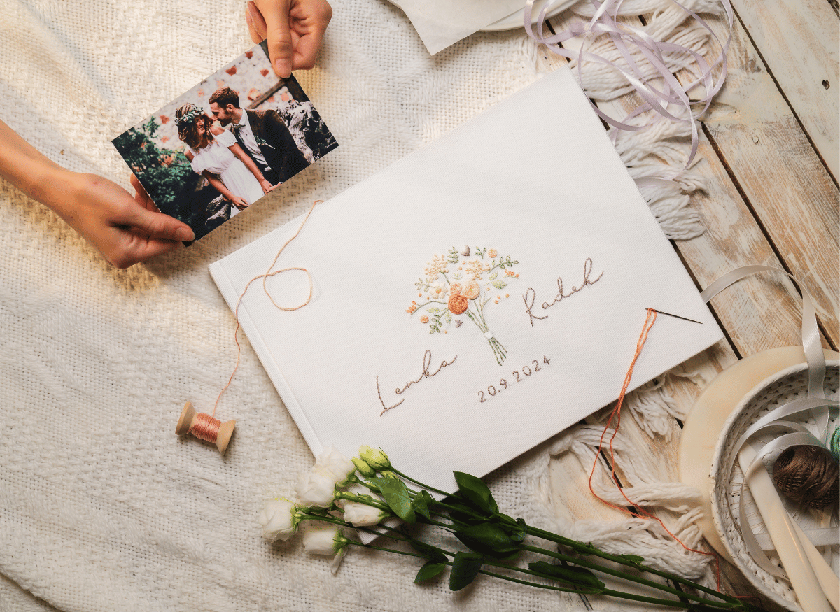 Ruční výšivka je krásná, ale má své nároky na prostor. Aby byl výsledek harmonický a technicky proveditelný, potřebuji od vás vědět požadovaný formát alba dříve, než začneme ladit detaily výšivky.